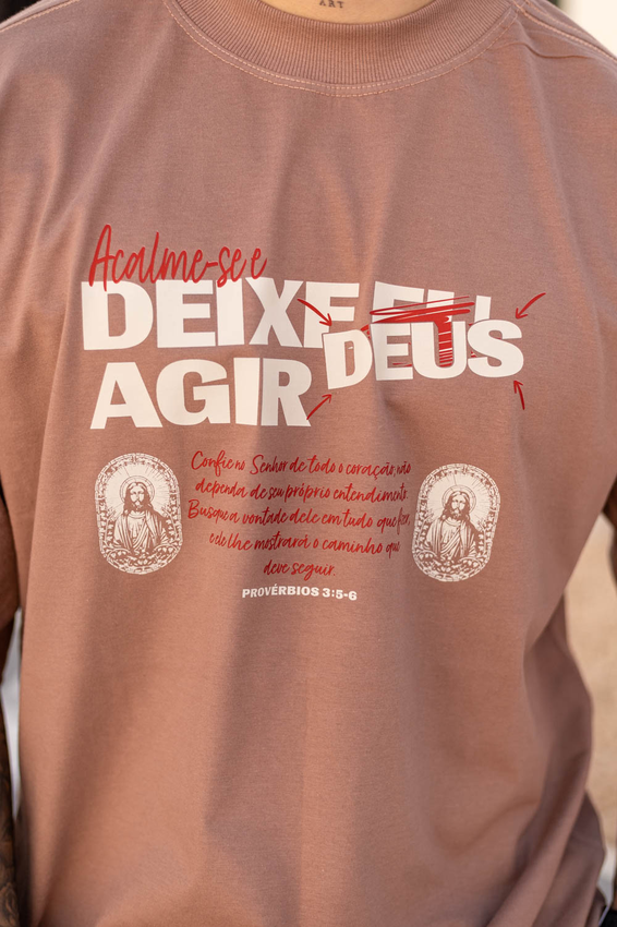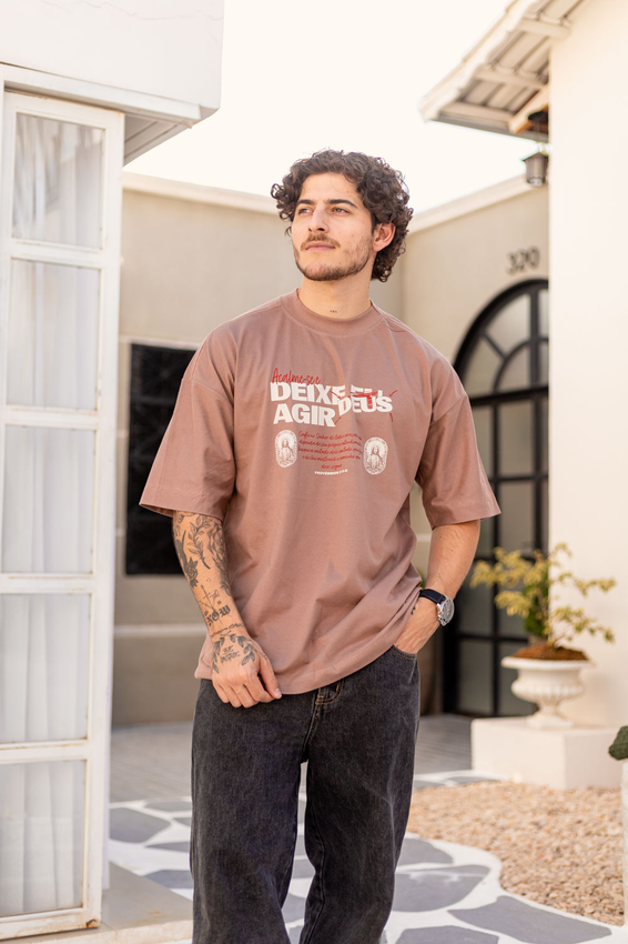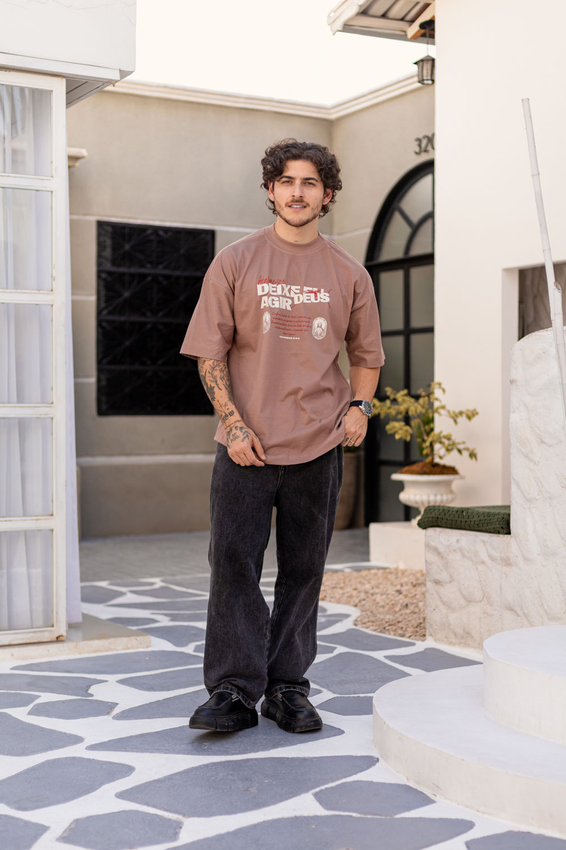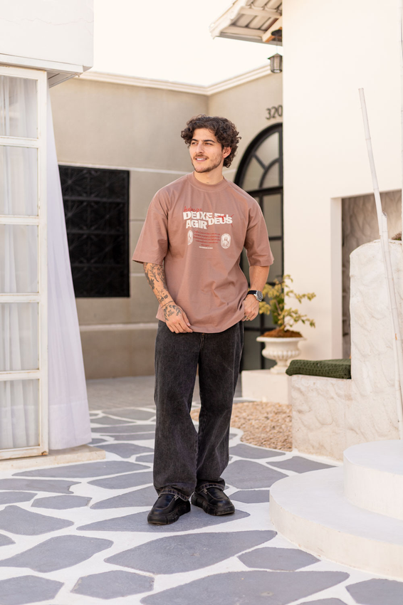 Camiseta Over com modelagem tradicional de camiseta Gola Alta em Ribana Canelada e costura ombro a ombro.