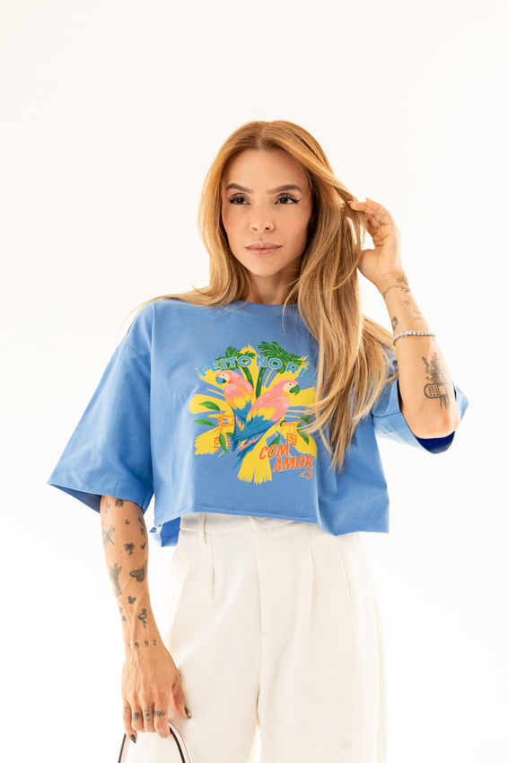 Cropped com modelagem tradicional de camiseta gola'' O''