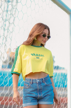 Cropped com modelagem tradicional de camiseta gola'' O''