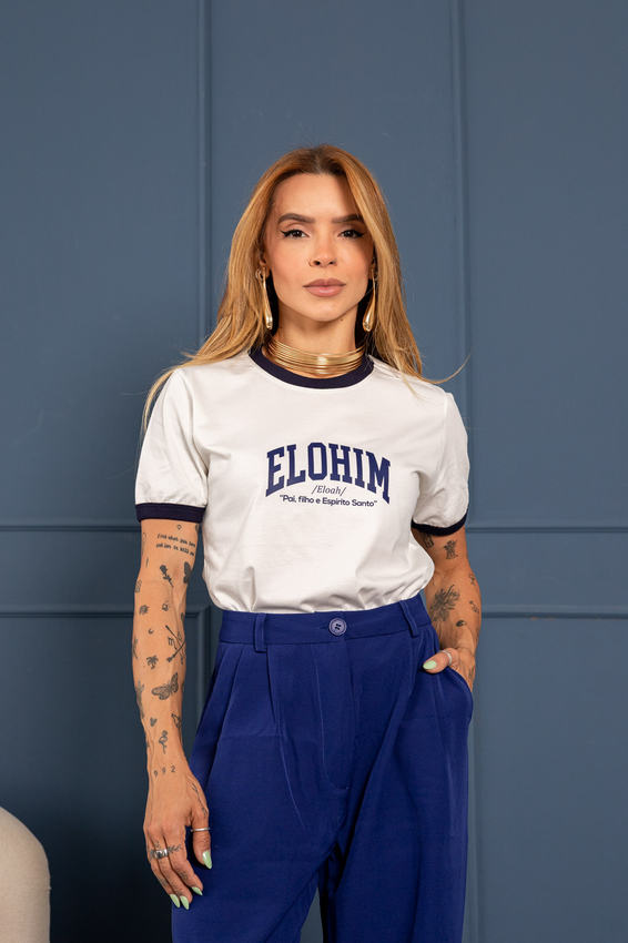 Tshirt com modelagem tradicional de camiseta gola''O'' com ribana, punhos e gola coloridos e costura ombro a ombro.