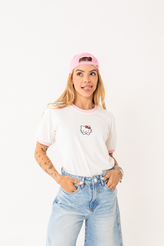Tshirt com modelagem tradicional de camiseta gola''O'' com ribana, punhos e gola coloridos e costura ombro a ombro.