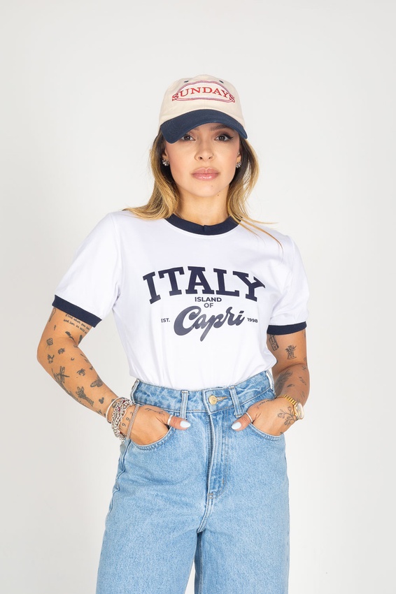 Tshirt com modelagem tradicional de camiseta gola''O'' com ribana, punhos e gola coloridos e costura ombro a ombro.