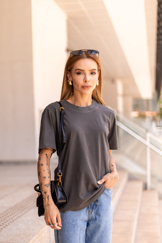 Tshirt Estonada com modelagem tradicional de camiseta gola''O'' com ribana e costura ombro a ombro.