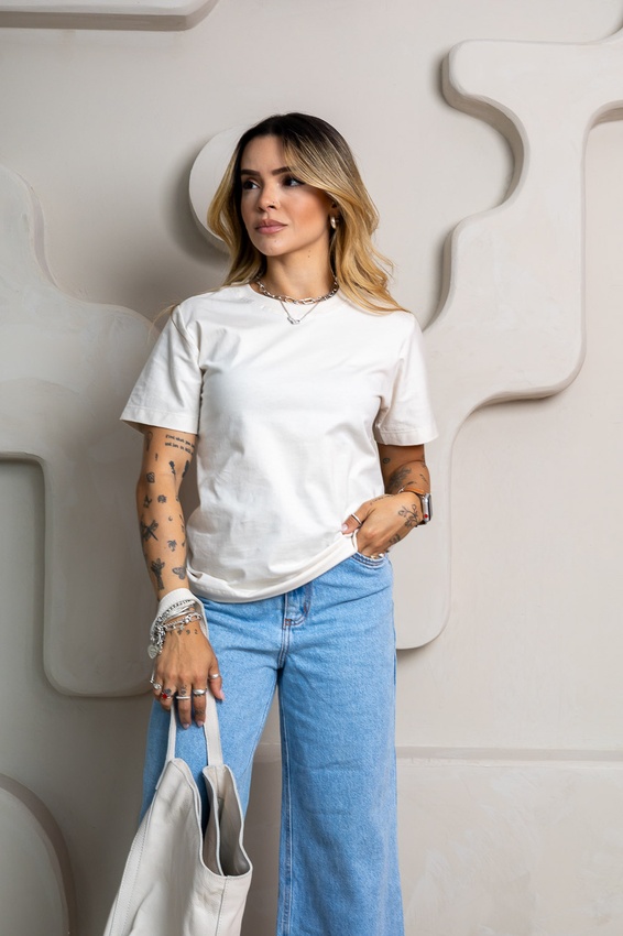 Tshirt com modelagem tradicional de camiseta gola''O'' com ribana e costura ombro a ombro.