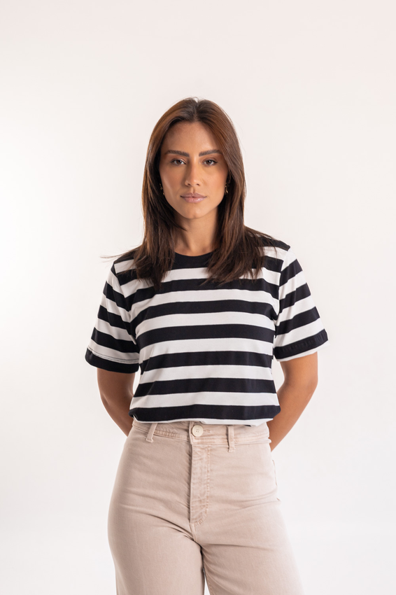 Tshirt com modelagem tradicional de camiseta gola''O'' com punho e gola em ribana e costura ombro a ombro.